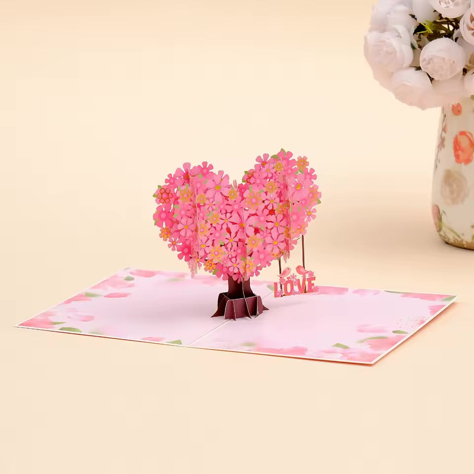Sevgililer Günü Özel 3D Pop-Up Aşk Ağacı | Kalpli Çiçek Tasarımlı Romantik Tebrik Kartı